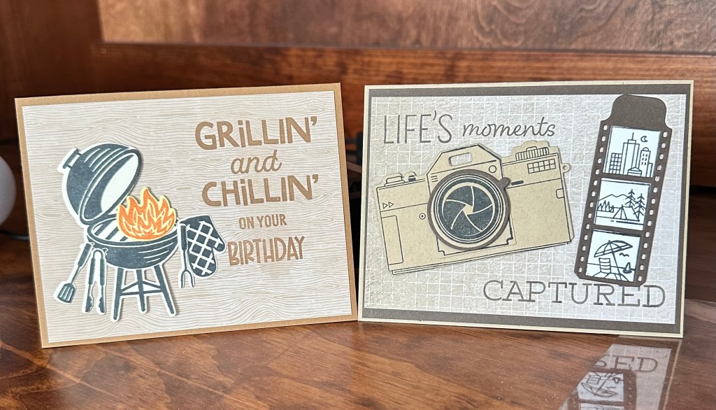 I have returned from OnStage 2026 in Long Beach California with many new ideas and a new catalogue too! The catalogue will be released on May 5th. Today’s featured cards are Stampin’ Up’s Online Exclusive, which are back in stock! The basic design of both cards are 5 1/2 x 8 1/2 and scored at 4 1/4. They are the landscape design. The card on the right is the BBQ Masters with Pecan Pie card base. The Wood Grain DSP 4 x 5 1/4 is the background for the sentiment from the stamp set. I stamped the sentiment on the DSP in Pecan Pie. The sentiment “on your birthday” is from the Reason to Celebrate stamp set. The grill and accessories are stamped in Momento Black and die cut. The card on the right Capturing Smiles is a Crumb Cake card base with a background layer of Early Espresso and the Nature Walk DSP. The sentiments are stamped in Early Espresso on the DSP. The camera parts are stamped in Momento and die cut in Crumb Cake cardstock. Both of these designs can be seen in reels on my Instagram howekl813 to see how they came together.