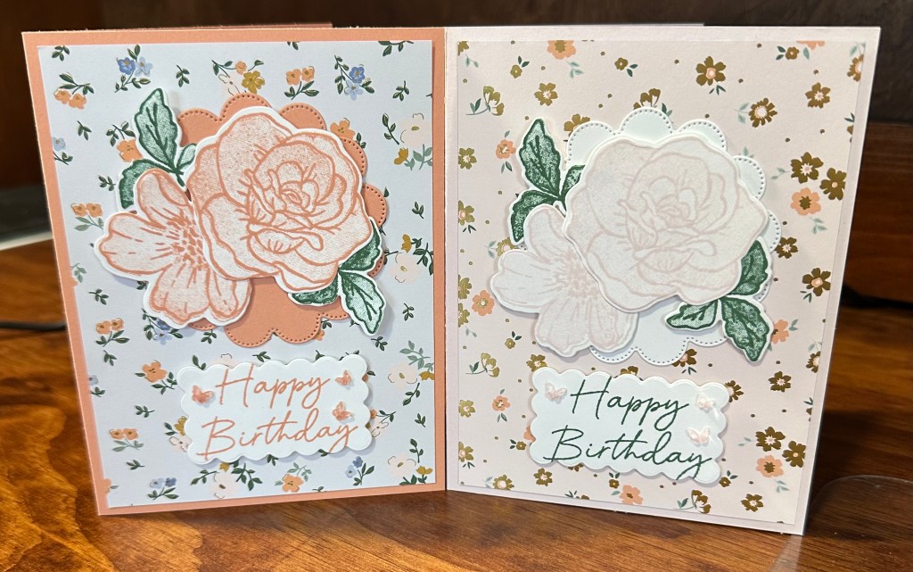 This week’s featured suite is Stampin’ Up’s Bloom Boutique Mega Suite. This suite will be available in May in the new catalogue. The suite includes two stamp set bundles with dies, Bloom Boutique Specialty DSP which are all the new InColors. Included also are the 2026-2028 InColor Butterflies for embellishments. The two card bases are Barely Blush and Crisp Cantaloupe 5 1/2 x 8 1/2 scored at 4 1/4. The two panels of DSP coordinate with the cardstock and are cut 4 x 5 1/4 and adhered with Stamp & Seal. The flower stamps in the set are the two step stamp. The detailed flower is stamped first in Crisp Cantaloupe full strength then the filler stamp is stamped off then filled in with Crisp Cantaloupe. The detailed leaves are stamped in Peaceful Pine full strength then the filler leaf is stamped off before filling in the leaf. In the second card the flowers are stamped with Barely Blush but full strength for both stamps. The flowers are layered on the Stitched Scalloped dies in Crisp Cantaloupe and Basic White cardstock. The flowers are adhered with dimensions. The label die on both cards is cut from Basic White cardstock. The sentiment is from the Scalloped Blooms stamp set. The InColors Butterflies are adhered to the label. Watch my Facebook Sunday Video to see how these birthday cards came together!